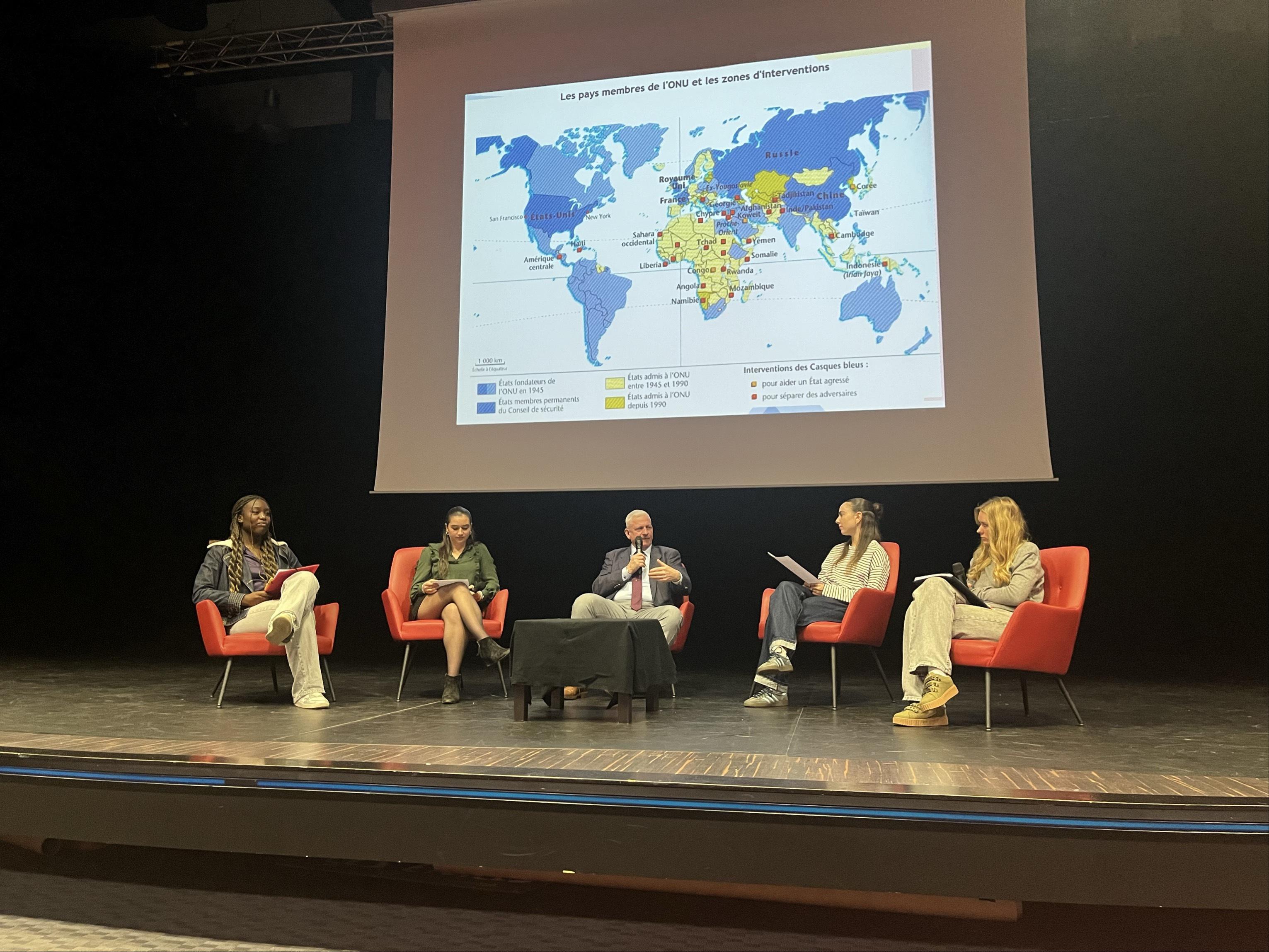 La conférence aborde les thématiques de la guerre et de la paix, sujets qui furent étudiés au préalable en classe. Le général Chanson y expose tout d’abord l’idée du « retour de la guerre », théorie selon laquelle la guerre reprend de l’ampleur au sein des sociétés depuis le début du 21e siècle. La considération importante accordée aux conflits influence l’ensemble de l’organisation mondiale. Les États imposent des taxes afin de financer des campagnes militaires, ce qui a pour conséquence la révolte populaire. Les guerres sont aujourd’hui caractérisées par leur lien constant à la mondialisation. Il s’agit, entre autre, de guerres commerciales et économiques, notamment causées par la hausse du protectionnisme et la volonté d’une hégémonie mondiale des pays les plus développés. Les barrières douanières et taxes frontalières se font plus nombreuses dans des conflits opposant les puissances telles que la Chine et les États-Unis. Si d’une part il est question de cette nouvelle arme de guerre, pour le moins dangereuse économiquement, d’autre part les guerres intraétatiques se multiplient dans le monde, opposant des belligérants aux rapports de force asymétrique, conduisant ainsi à des massacres et une létalité forte. Au cours de sa vie professionnelle, le Général Chanson vit la guerre et ses changements. Les conflits connaissent depuis la fin de la guerre froide et l’arrivée de l’arme atomique de grandes évolutions.