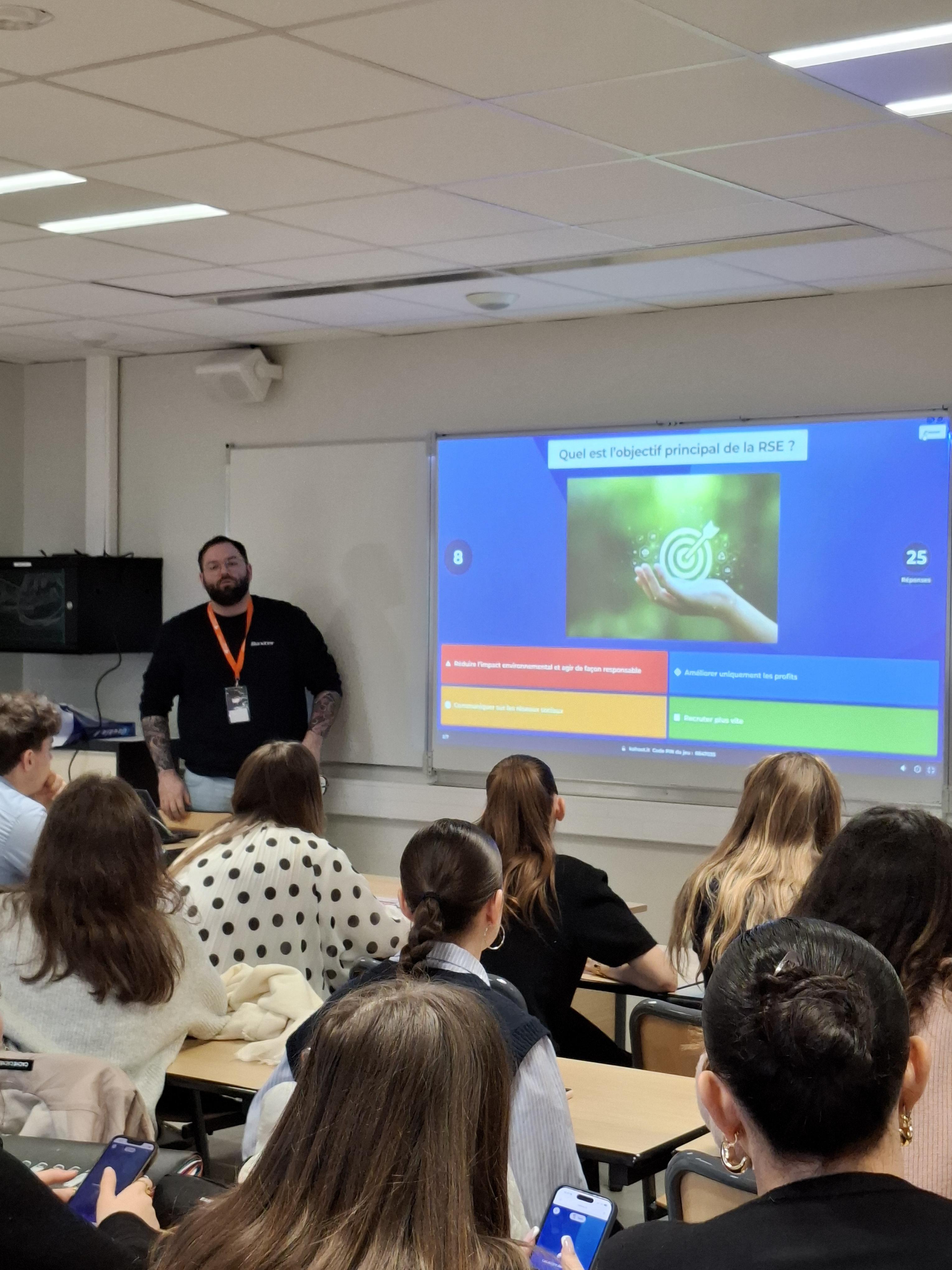 L'intervention a débuté par un Kahoot interactif sur la RSE. Ce moment convivial a permis aux étudiants de tester leurs connaissances et d'introduire la thématique de l'intervention.